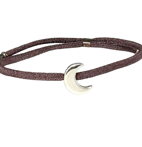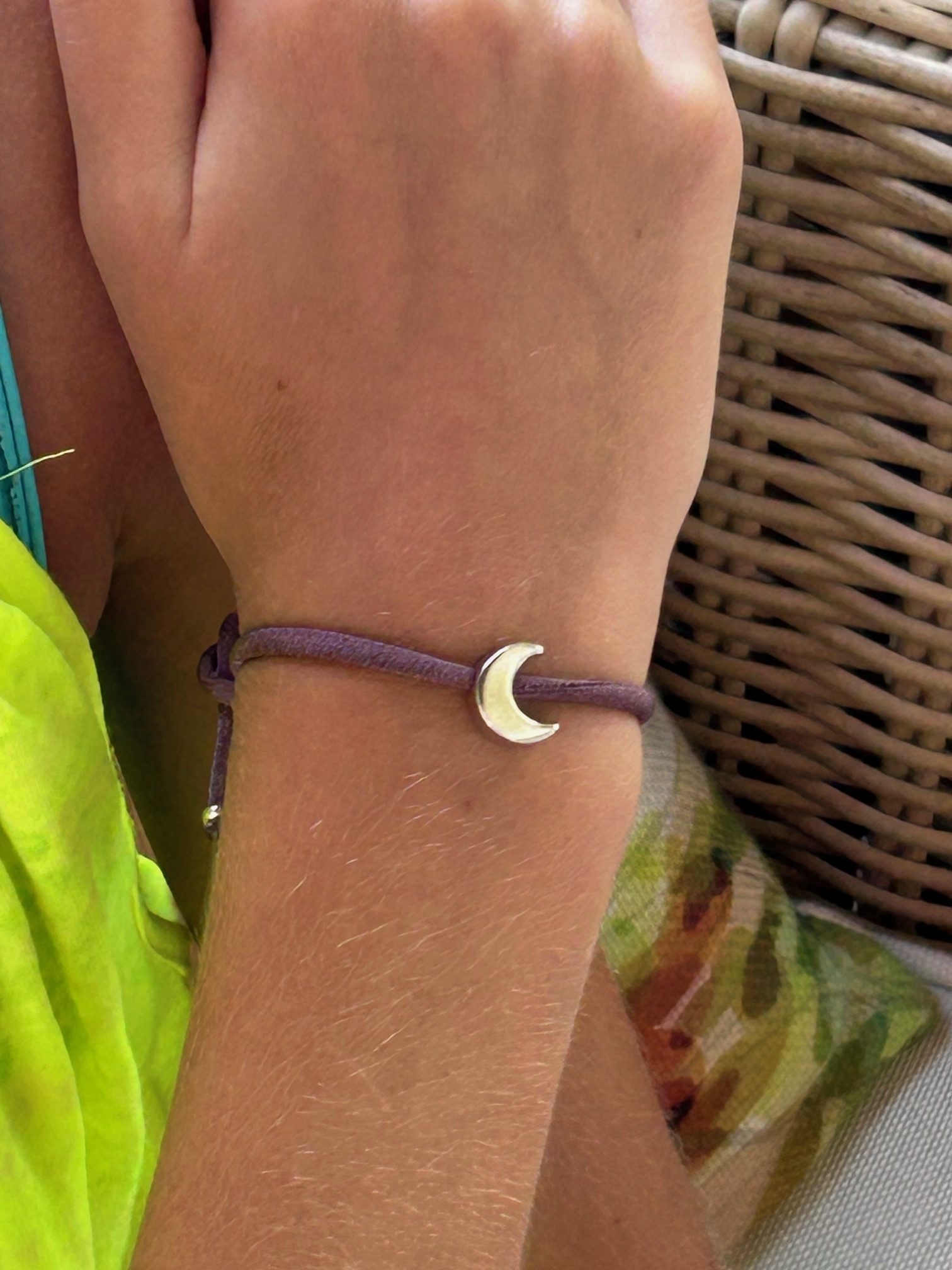 Esta pulsera de luna está hecha de plata 925. Se puede personalizar con una inicial pequeña pero quedaría muy pequeña. Lleva cierre ajustable que se adapta a cualquier tipo de muñeca perfectamente.