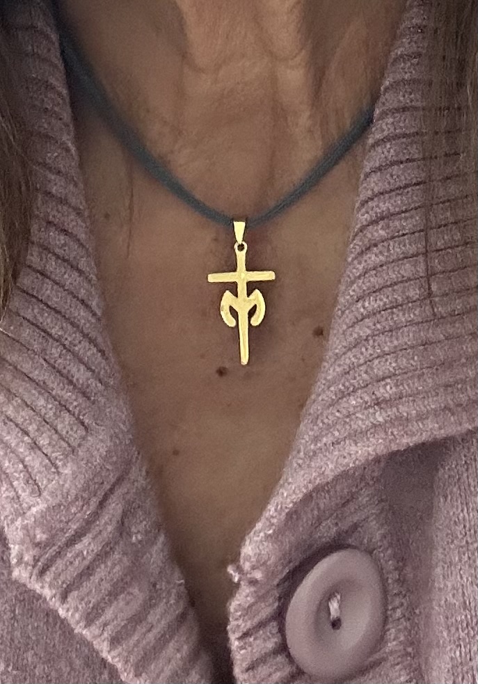 Collar con cruz marianista de 27 x 16 mm y 2 mm de grosor. Disponible en acero oro, acero rosa y acero color plata.