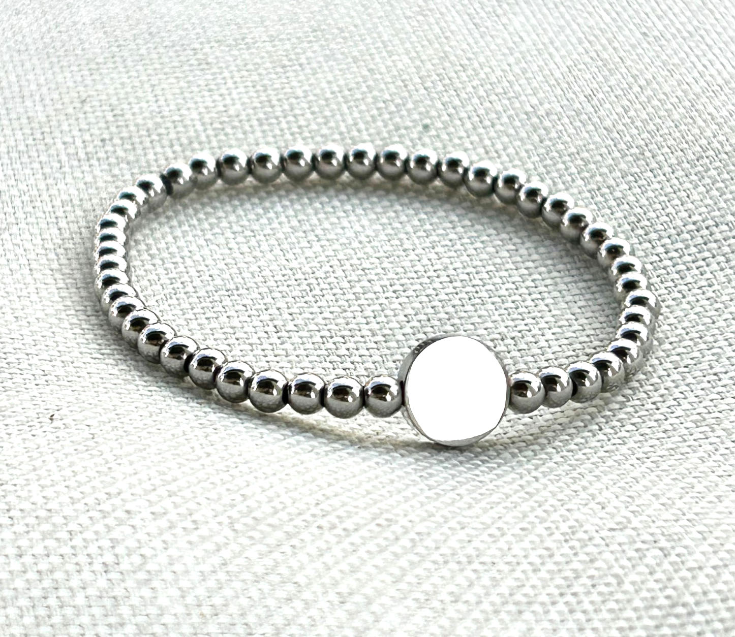 Esta pulsera está hecha con bolas de acero de 4 mm y lleva un botón de 10 mm para personalizar. Es una pulsera está hecha de goma doble, no silicona, reforzada y fuerte. Es una pulsera elástica y son standar, para una medida de muñeca de 17 ó 18 cm que sería una talla S.