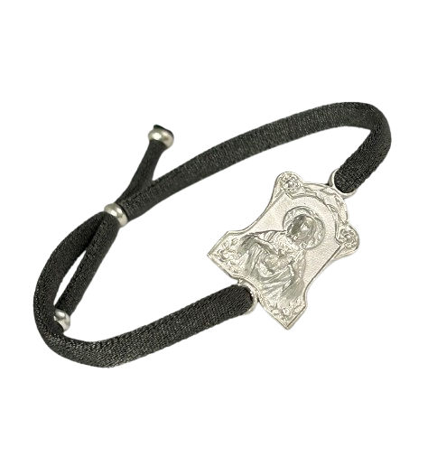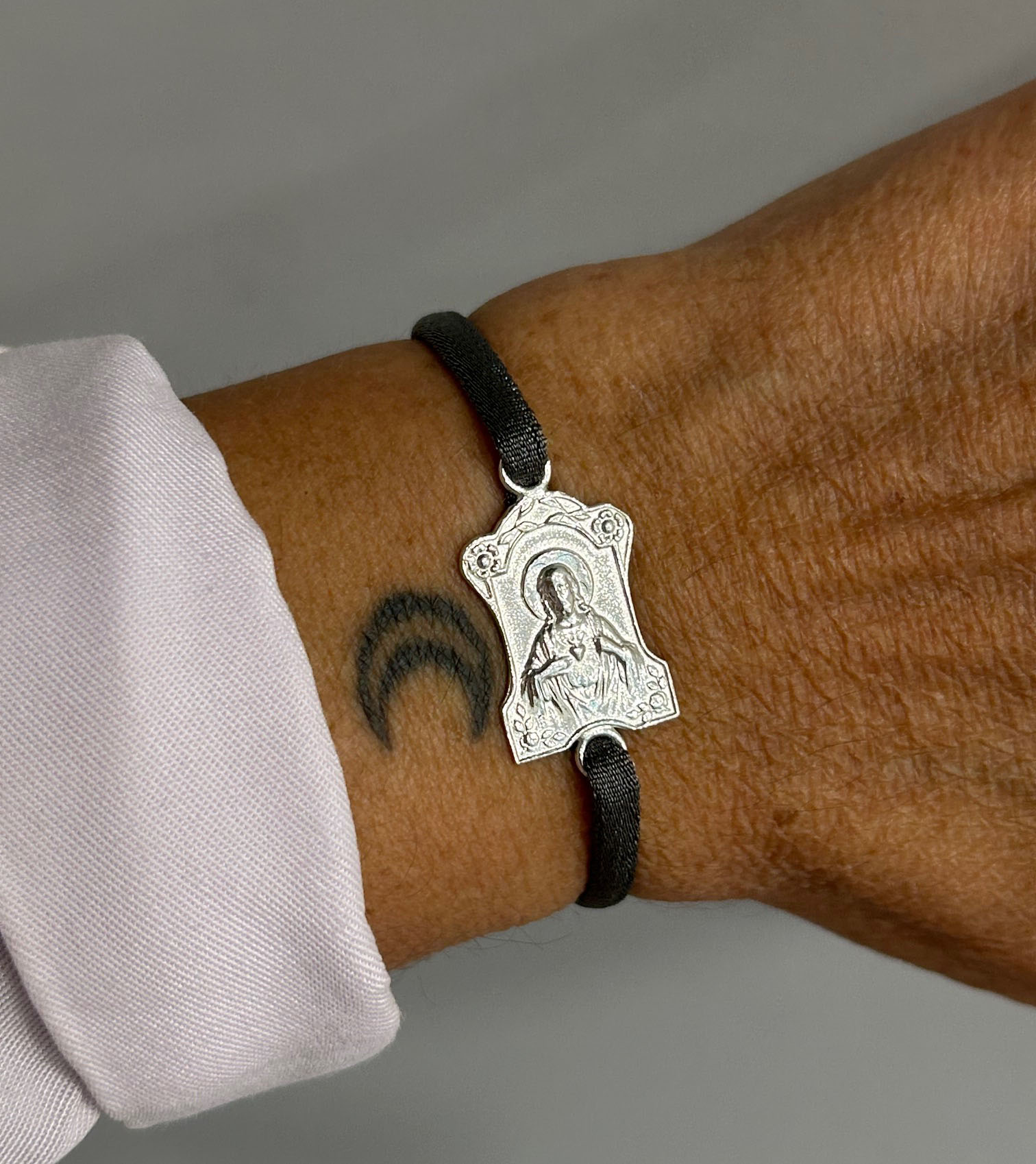 Pulsera hecha con escapulario muy antiguo y vuelto a fabricar de la Virgen del Carmen y Sagrado Corazón. Está hecha con un cordón elástico y lleva un cierre ajustable que se adapta perfectamente a cualquier muñeca.